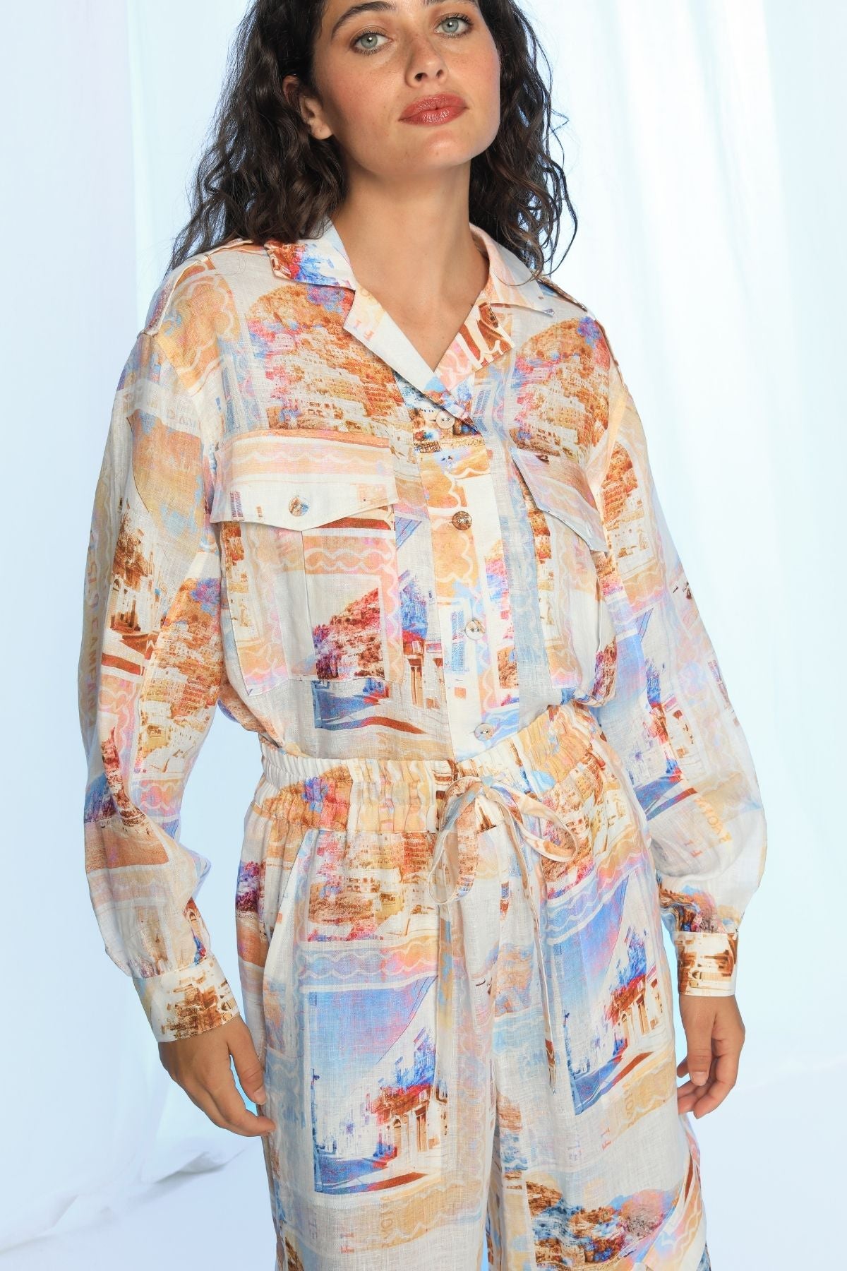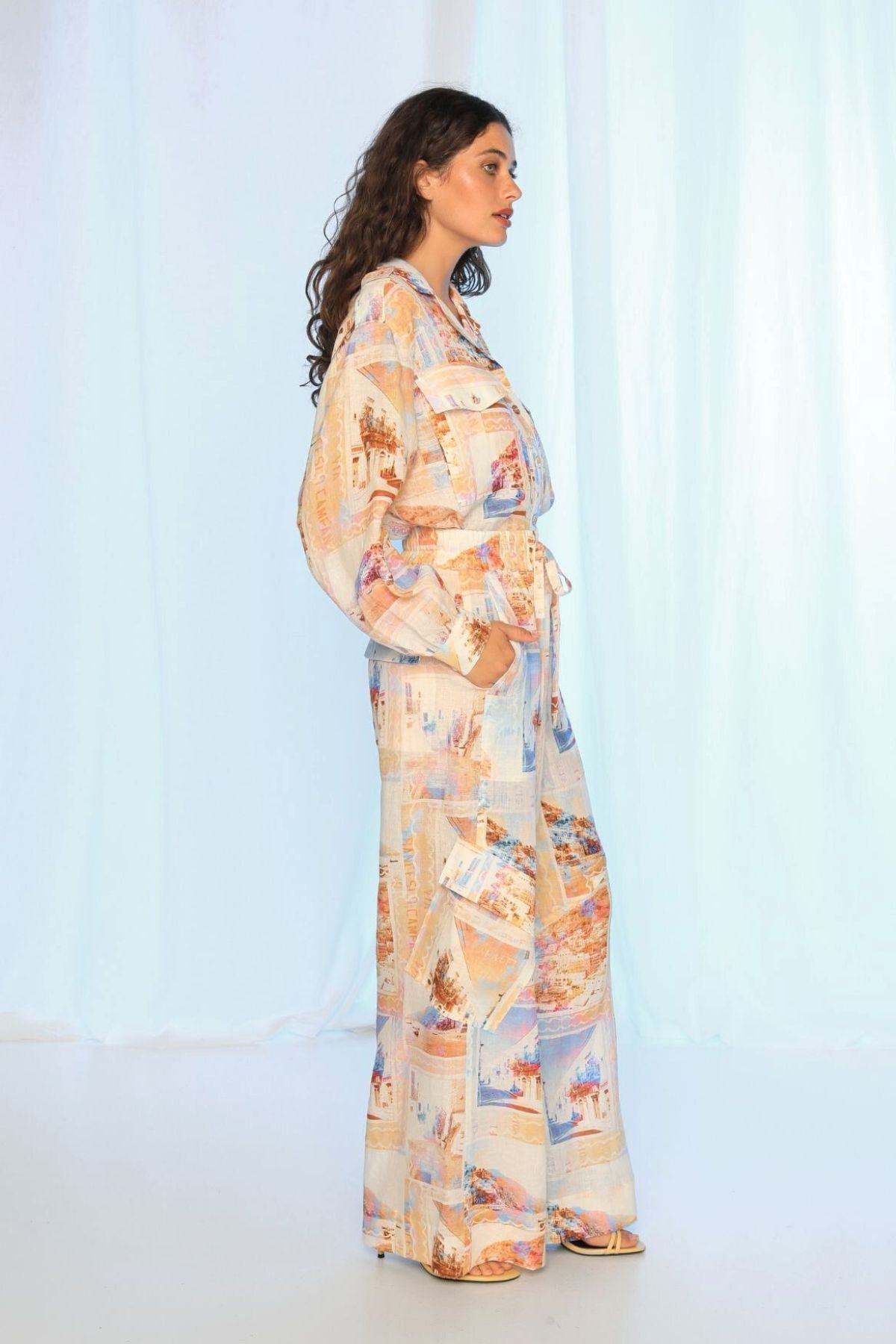 New lightweight linen pants by Australian fashion label Kachel are a must-have for summer. Made from 100% light weight linen they feature a holiday-inspired print and have a relaxed wide-leg silhouette with a tie-front waistband.