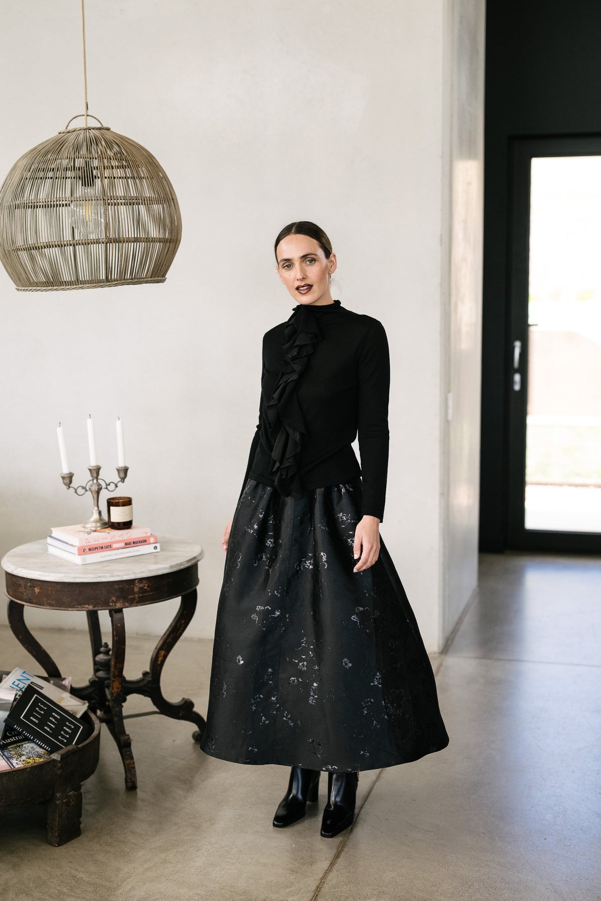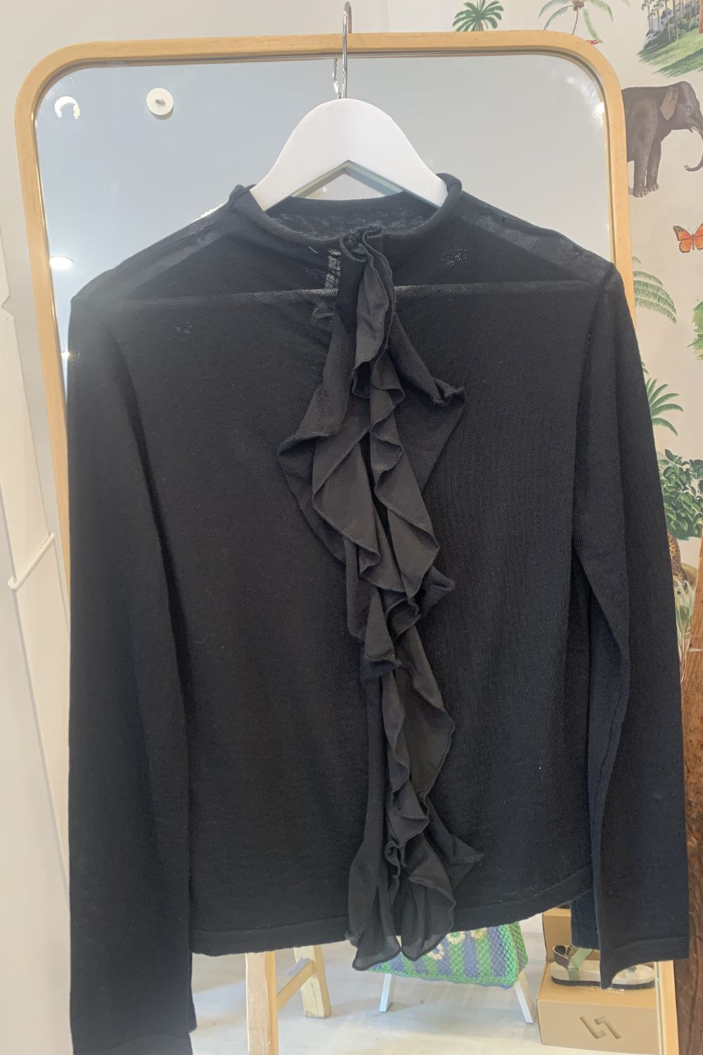 A black turtleneck with ruffle detail from M.A Dainty is a modern-classic for your winter wardrobe. A lighgtweight knit it's fitted silhouette makes it ideal for layering and it features a delicate silk ruffle detail down the front.