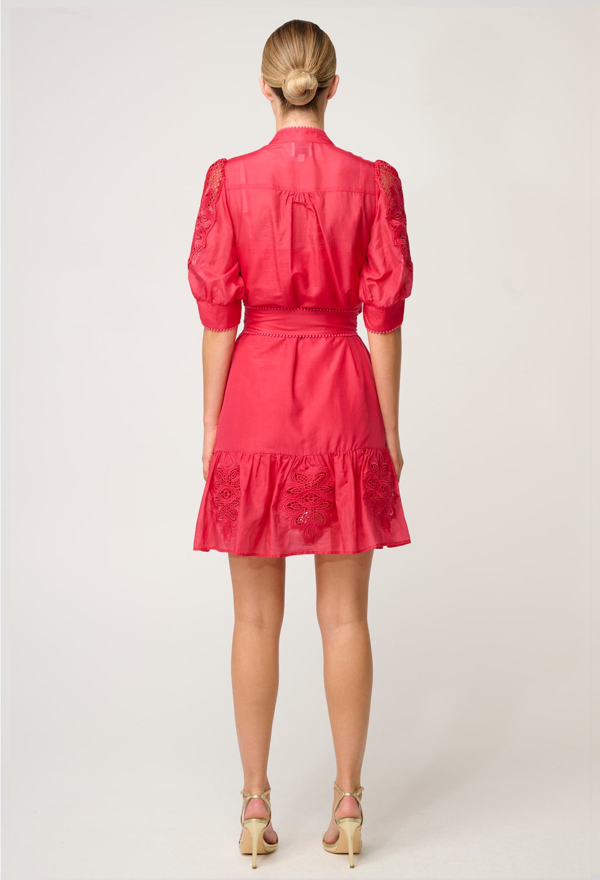The vibrant ruby hue brings warmth and sophistication to any occasion, while the intricate embroidery detailing on the sleeves and hem adds a touch of artisanal craftsmanship. The elasticated waist and self-tie belt create a flattering, adjustable fit, and the tiered hemline lends graceful movement to every step.