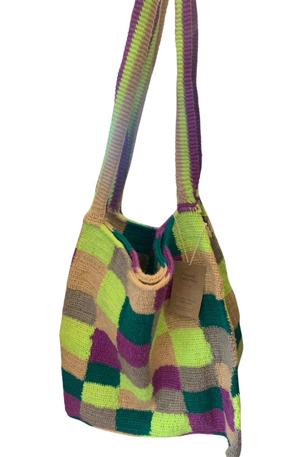 Handwoven bilum bag by Project Two Mile. Each bag is unique and beautifully hand-crafted by women from the squatter settlements of Port Moresby, Papua New Guinea. Project Two Mile is an initiative to support the lives of marginalised women in PNG by providing a global platform for their artwork and crafts.