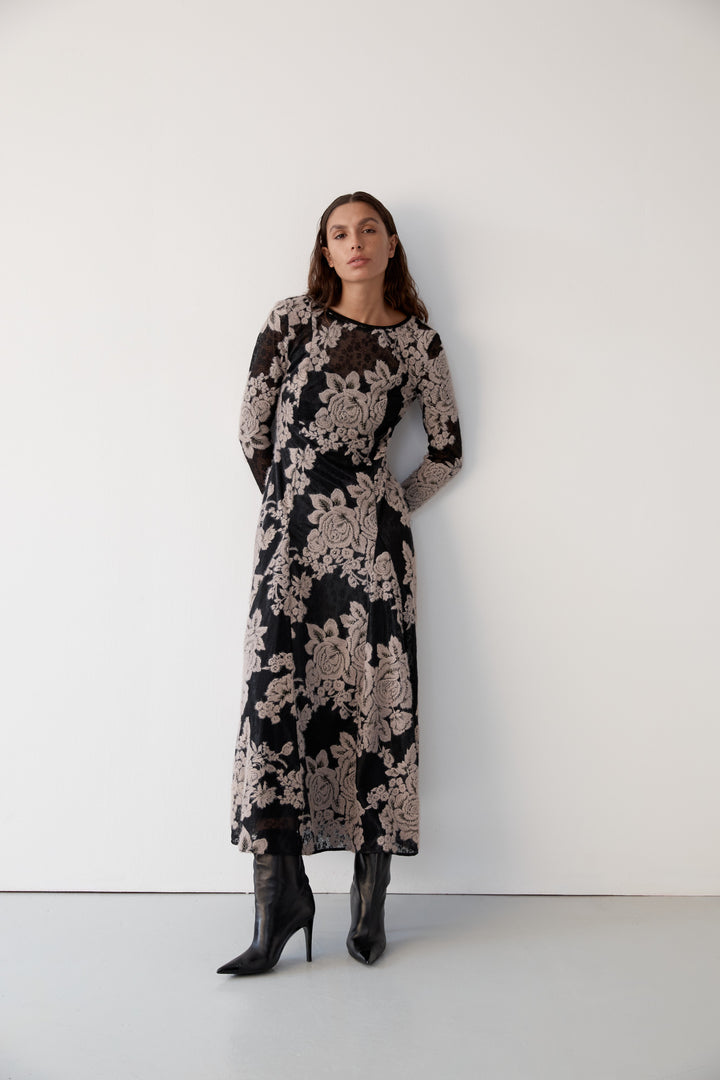New floral print maxi dress by Australian fashion brand Mos the Label is a must-have for your new season wardrobe. Romantic and feminine it features beautifully textured florals against a black background and falls at a flattering maxi length. With a round neckline and long, fitted sleeves it has godet detailing at the front creating a voluminous skirt with graceful movement.