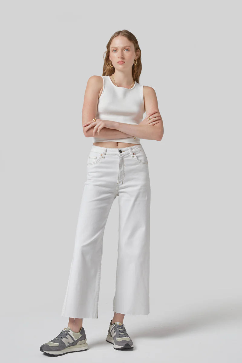 Barrie is a wide leg jeans designed mid to high rise. In white colour with contrast stitching, these jeans are cut from premium stretch denim.